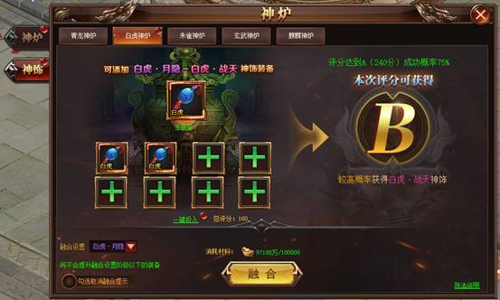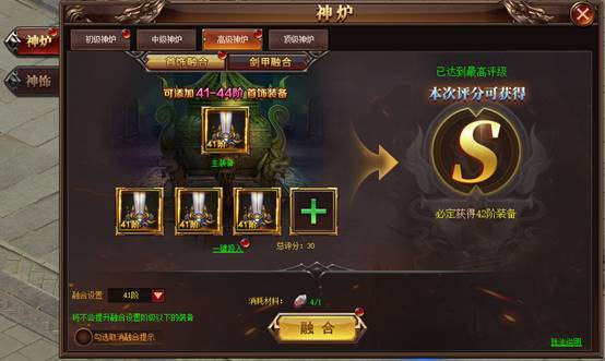 神炉划分装备阶级,只有在阶级范围内的装备才能融合,融合需要消耗装备、货币或材料