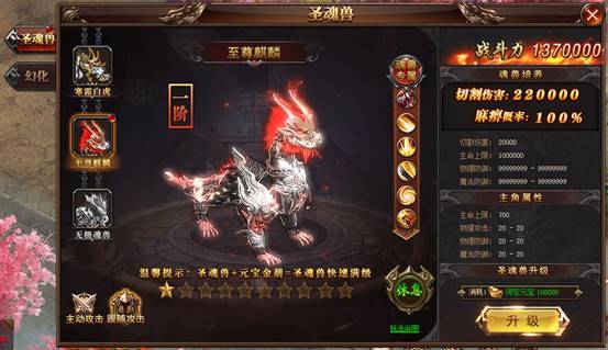 圣魂兽可消耗元宝提升星级,每提升10星,可自动升阶