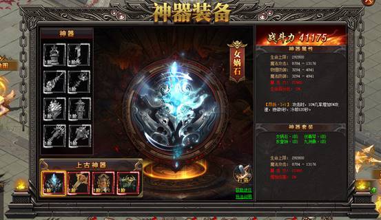 神器分为神器和上古神器,总共12个神器装备槽,穿戴指定的神器或上古神器