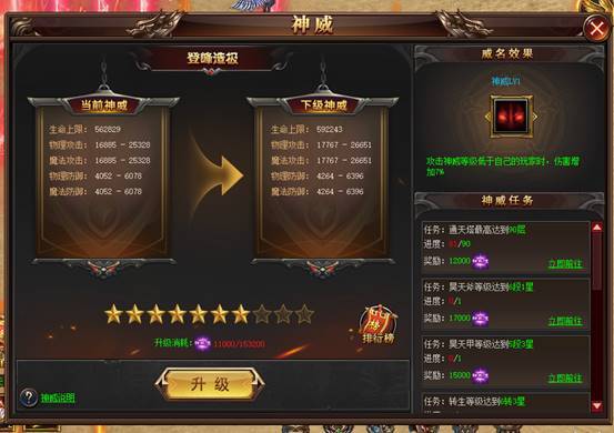 消耗神威值提升神威等级,可提供属性加成,提升神威技能等级